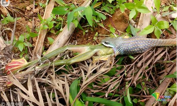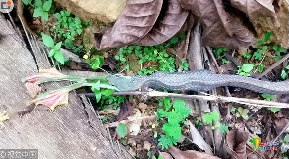 2018年7月18日,廣東東莞,藍(lán)綠鵲與蛇的地盤爭斗。