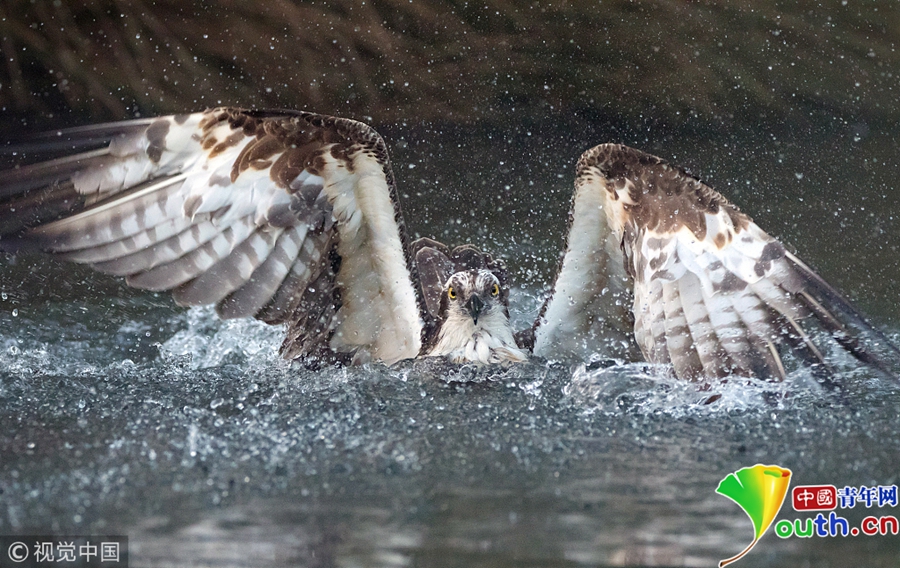 一只魚鷹潛入湖中捉鱒魚,激起巨大的水花。圖片作者/視覺中國
