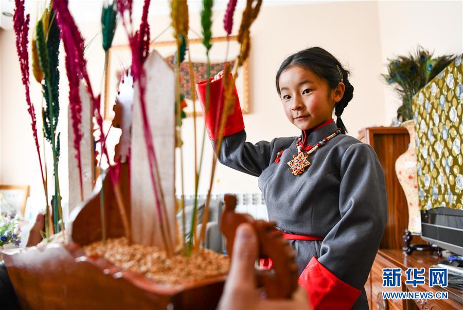 一名身著藏裝的藏族小姑娘在吃切瑪(2月24日攝)。當(dāng)日是藏歷新年初一,西藏各地群眾歡度藏歷新年。受新冠肺炎疫情影響,當(dāng)?shù)靥岢娫挵菽?、少出門、不聚集,居家享受新年樂趣。新華社記者晉美多吉攝