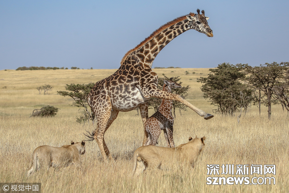 當?shù)貢r間2018年8月15日,肯尼亞馬賽馬拉,當?shù)貙в握材匪埂ぜ{帕索(James Nampaso)拍攝到一群獅子圍攻母長頸鹿和她的幼崽。盡管長頸鹿勇敢地抵抗獅群的進攻,但當一頭母獅跳上它的脊背時,它被分散了注意力,使得獅群最終捕獲了它的孩子。