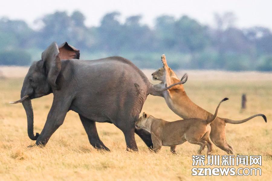 英國攝影師詹姆斯(James Gifford)在博茨瓦納喬貝國家公園拍到一群獅子獵食大象的精彩畫面。在詹姆斯的鏡頭下,一頭母獅跳到了一頭小象的背上想要將其拿下,但僅憑一己之力又不能做到。但當母獅的后援抵達時,象群也趕到了現(xiàn)場。最終,小象回到了象群中獲得庇護,而獅群也不得不悻悻離去。