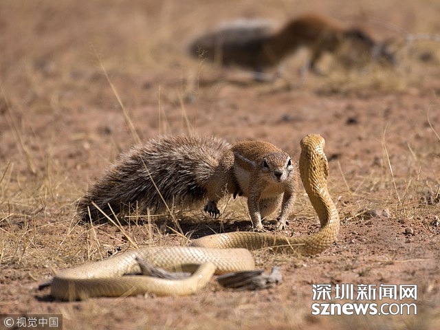 當(dāng)?shù)貢r間2016年10月25日,南非博茨瓦納的卡格拉格帝越界公園,眼鏡蛇和地松鼠之間發(fā)生激烈打斗,但都沒有受傷。野生動物攝影師Hannes Rossouw拍攝了這一過程。
