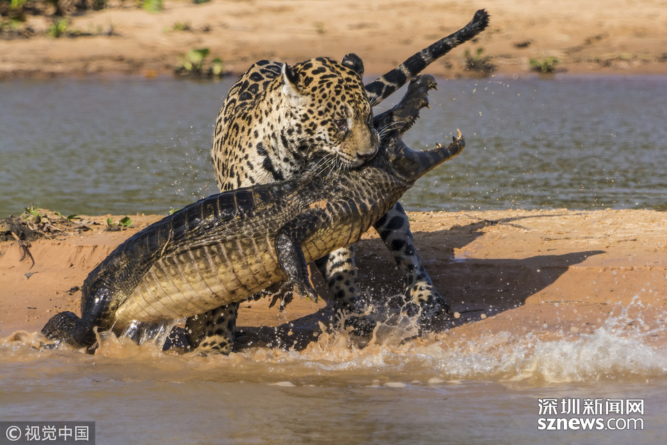 當(dāng)?shù)貢r間2013年8月25日,巴西潘特納爾,一頭雄性美洲豹攻擊了一條巴拉圭凱門鱷并與之纏斗。這只美洲豹預(yù)先躲在水中匍匐前進,然后突然出現(xiàn)把這只鱷魚震住,隨后用牙刺進鱷魚的堅硬的外殼中,將其拖入?yún)擦帧?/p>