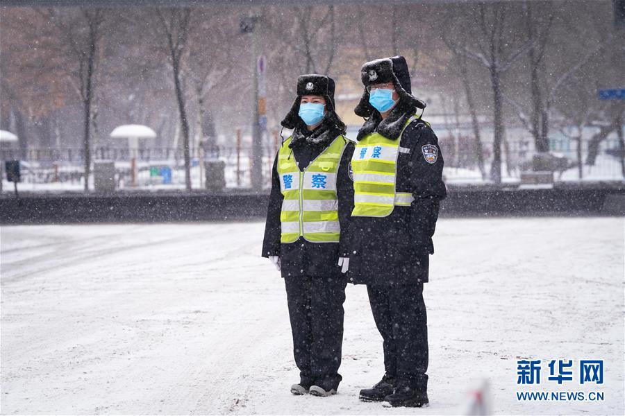 李可心(右)與同事在雪中值守(2月28日攝)。 新華社記者王松攝