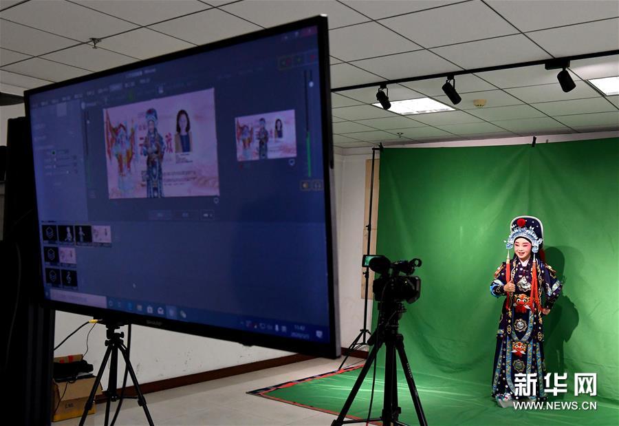 3月3日,李金玲在鄭州文化館通過直播的形式進行帶妝表演豫劇《花木蘭》選段。新華社記者 李安 攝