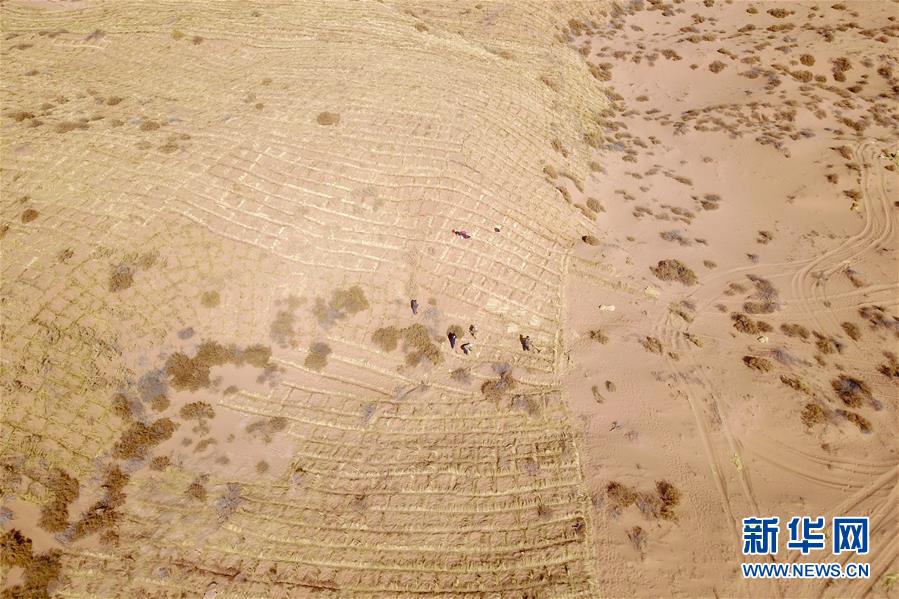 3月5日,在古浪縣北部沙區(qū)旱麻崗治沙點(diǎn),群眾扎草方格壓沙(無人機(jī)照片)。初春時(shí)節(jié),在騰格里沙漠南緣的甘肅省武威市古浪縣,當(dāng)?shù)馗刹柯毠ぜ鞍瞬缴沉謭鲋紊橙斯餐诳h城北部沙區(qū)旱麻崗治沙點(diǎn)開展春季治沙勞動(dòng)。新華社記者 范培珅 攝
