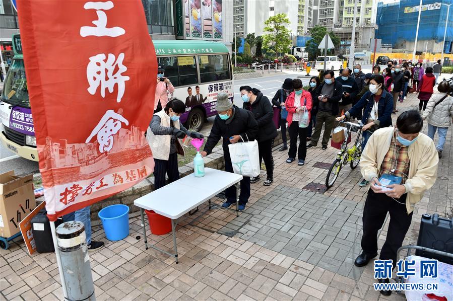 2月23日,市民排隊領取消毒清潔劑。當日,香港工聯(lián)會在將軍澳向市民免費派發(fā)消毒清潔劑。新華社記者盧炳輝攝