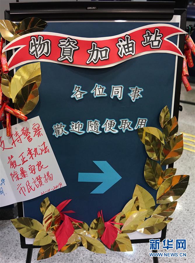 在香港西區(qū)警署一角的物資加油站標牌上貼著市民手寫的心意卡(1月27日拍攝)。新華社記者李鋼攝