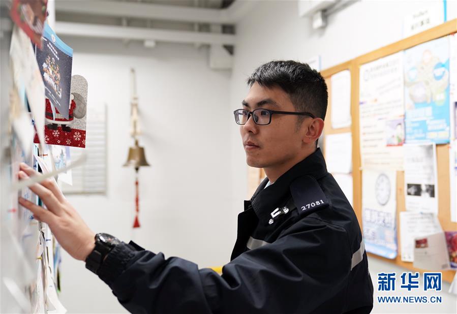 香港西區(qū)警署第三梯隊成員李Sir瀏覽市民寄來的心意卡(1月27日攝)。新華社記者李鋼攝
