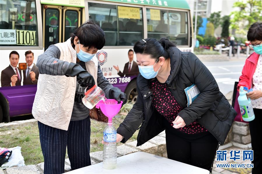 2月23日,市民領取消毒清潔劑。在將軍澳向市民免費派發(fā)消毒清潔劑。當日,香港工聯(lián)會新華社記者盧炳輝攝