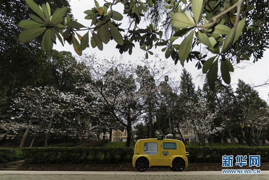 一輛5G無人攝像車在武漢大學(xué)櫻花大道進(jìn)行不間斷無人巡游,實時采集和傳輸直播圖像信號(3月16日攝)。新華社記者費茂華攝