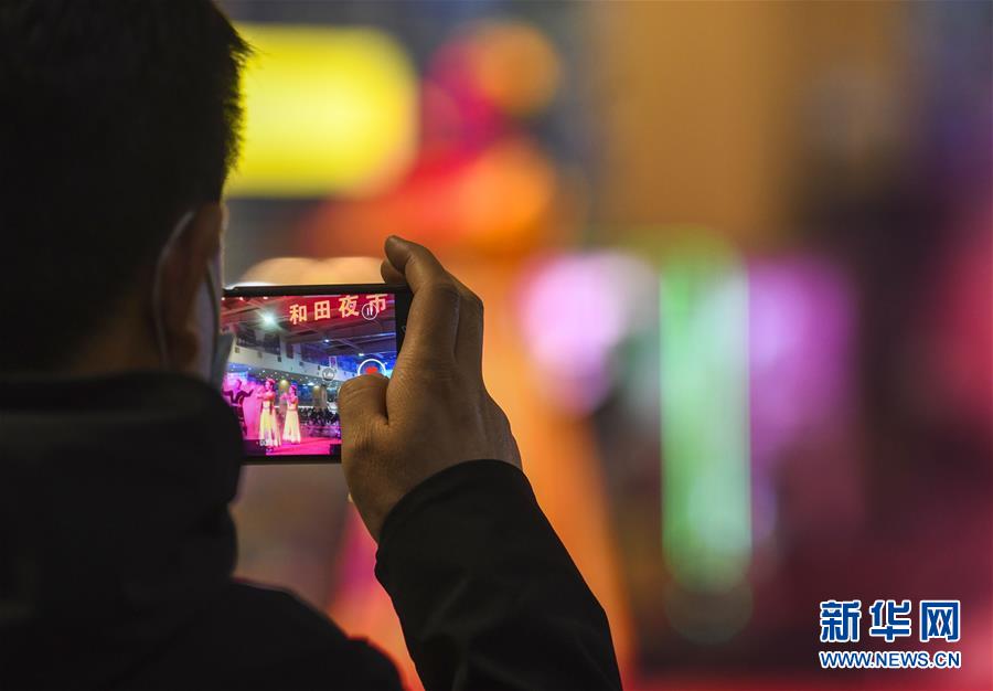 3月16日,在和田夜市環(huán)湖店,食客用手機拍攝夜市上的舞蹈節(jié)目。新華社記者 趙戈 攝