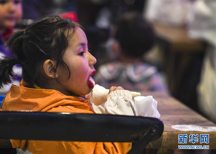 3月16日,在和田夜市環(huán)湖店,一個小朋友在品嘗美食。新華社記者 趙戈 攝