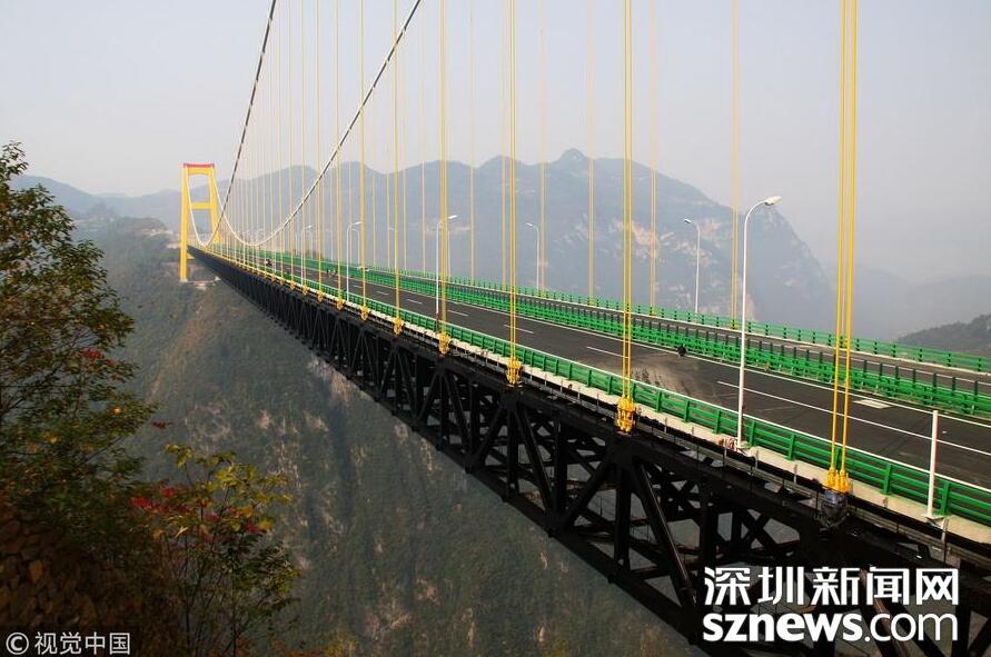 【世界第一高懸索橋——四渡河大橋】四渡河特大橋位于巴東縣野三關(guān)鎮(zhèn)四渡河,大橋主跨900米,橋面與峽谷谷底高差達(dá)560米,相當(dāng)于200層樓高,是目前國內(nèi)在深山峽谷里修建的最大跨度懸索橋,比目前世界最高橋法國米約大橋還要高290米,被譽為世界第一高懸索橋。