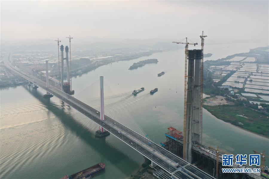 3月18日拍攝的廣州南沙港鐵路跨西江斜拉橋主塔封頂施工現(xiàn)場(無人機(jī)照片)。當(dāng)日,中鐵十一局承建的粵港澳大灣區(qū)重點工程——廣州南沙港鐵路跨西江斜拉橋主塔封頂,大橋整體建設(shè)取得重要進(jìn)展。該橋位于廣東佛山市和江門市交界處,全長1117.5米。新華社記者劉大偉攝