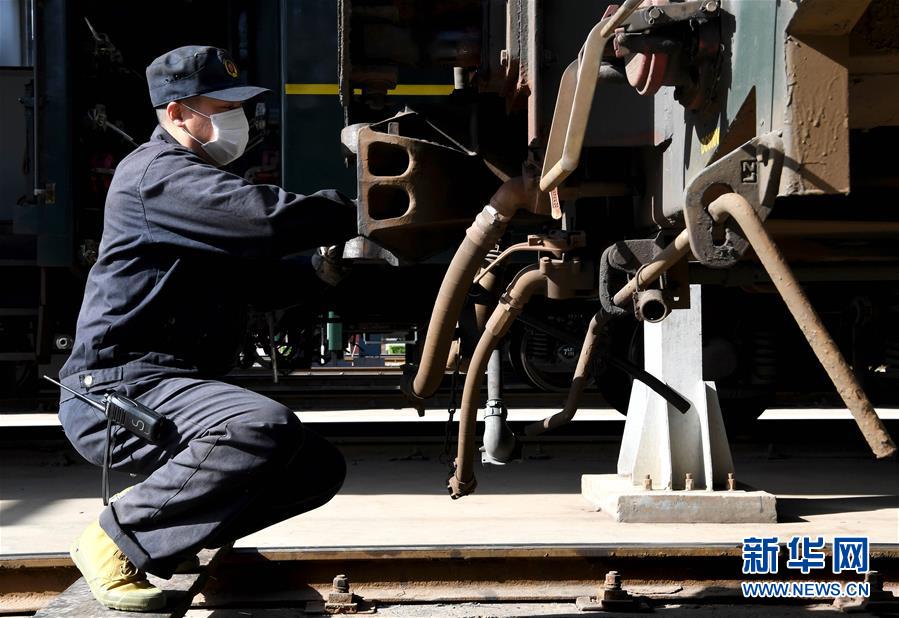 3月19日,鄭州車輛段客車檢車員在檢查客車車鉤鉤身。新華社記者 李安 攝