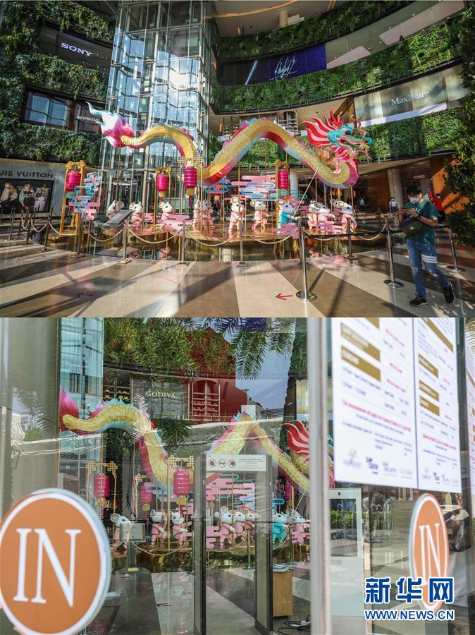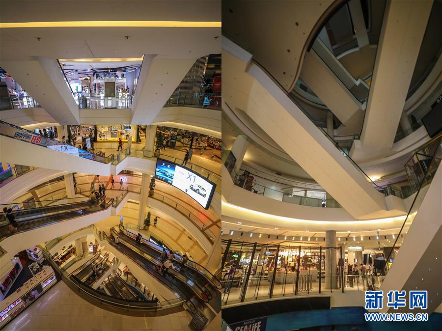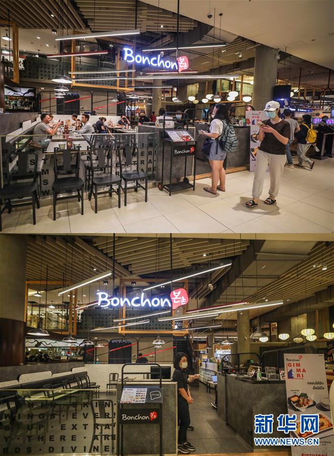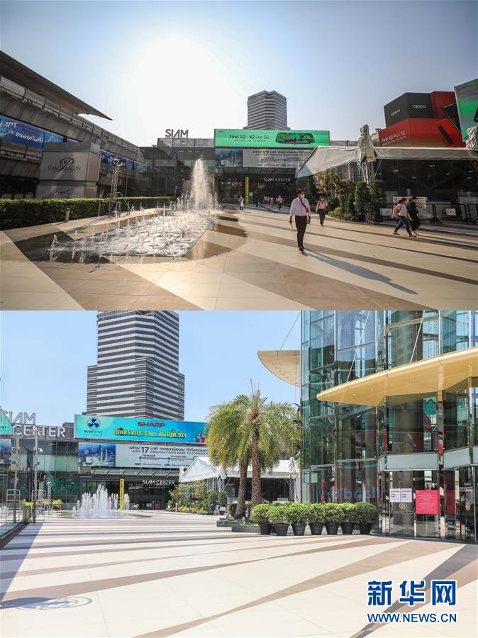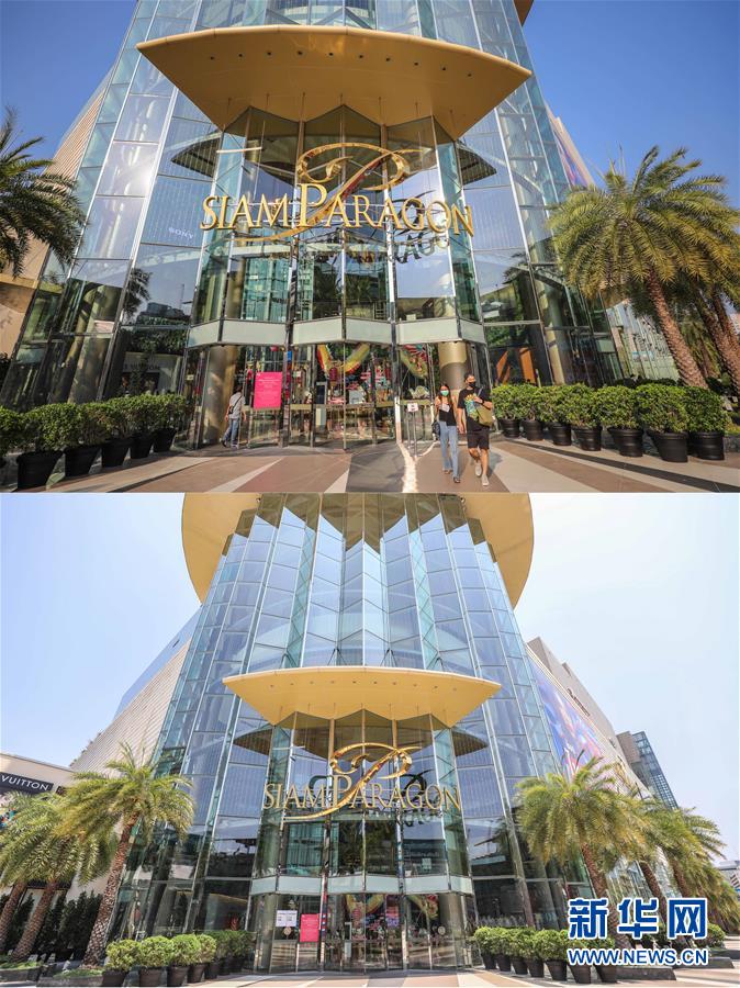 這是3月21日拍攝的泰國曼谷暹羅百麗宮商場(上圖)和3月22日拍攝的停止?fàn)I業(yè)的商場的對比圖。新華社記者張可任攝
