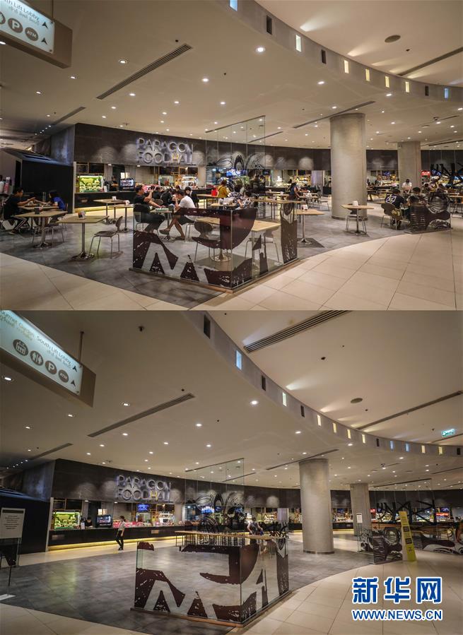 這是3月21日拍攝的泰國曼谷暹羅百麗宮商場負一層的美食城(上圖)和3月22日拍攝的美食城對比圖。商場除了負一層的美食城和超市外,全部關(guān)閉。美食城只對顧客提供外賣服務(wù)。新華社記者張可任攝