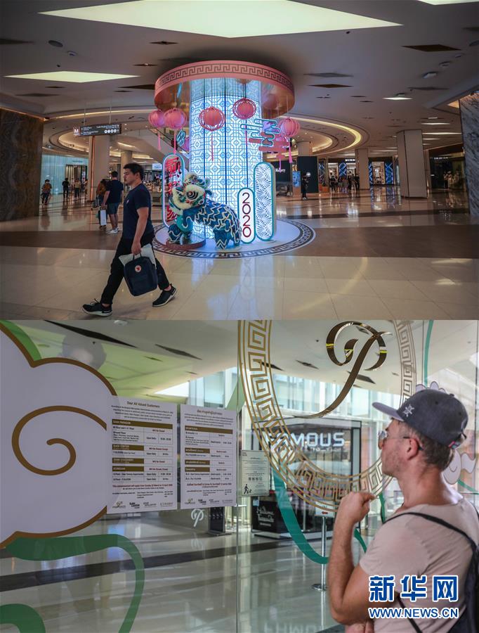 這張拼版照片顯示,3月21日顧客在泰國曼谷暹羅百麗宮商場購物(上圖)和3月22日一名游客在泰國曼谷暹羅百麗宮商場門口查看停業(yè)公告。新華社記者張可任攝