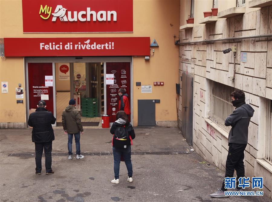 3月14日,在意大利首都羅馬,顧客排隊(duì)等待進(jìn)入超市。新華社記者劉詠秋攝