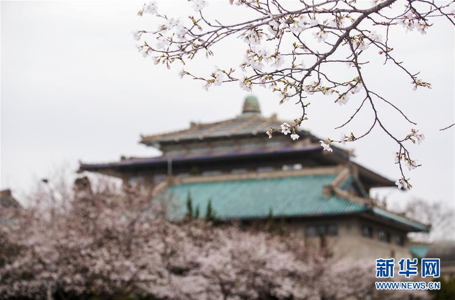 近日,隨著氣溫上升,武漢大學圖書館附近一片櫻花開放。新華社記者費茂華攝