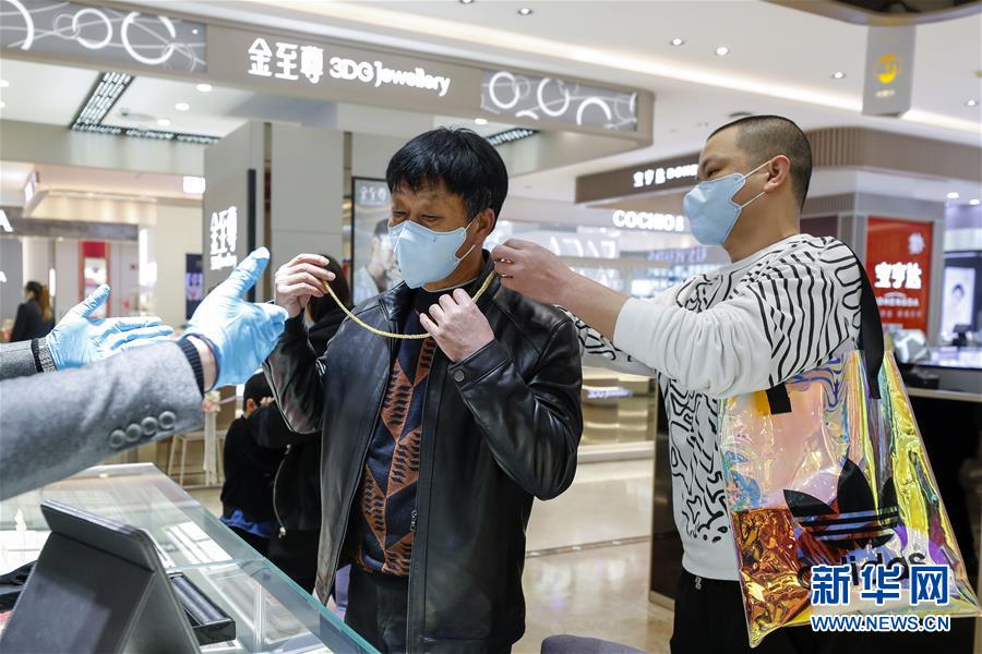 3月30日,在武漢市武商世貿(mào)廣場,顧客(右二)在挑選飾品。當日,武漢市多家商場開門迎客。新華社記者沈伯韓攝