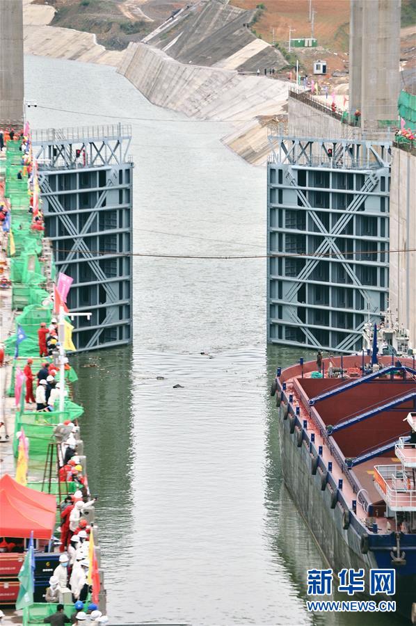這是3月31日拍攝的正在打開的大藤峽水利樞紐工程船閘上閘首人字門。當日,廣西大藤峽水利樞紐工程船閘試通航啟動,預計一年后可正式通航。新華社記者崔博文攝