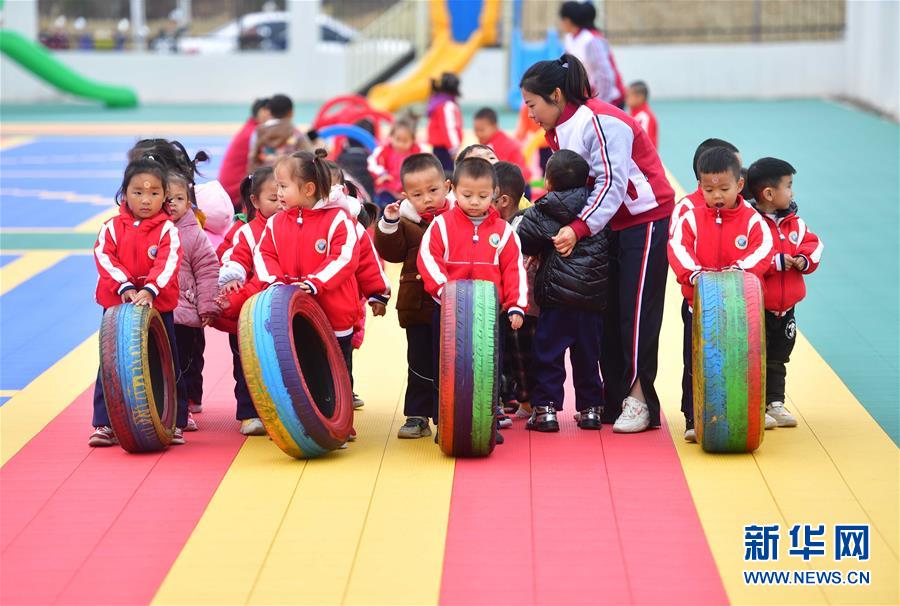 在融安縣遂融幼兒園,搬遷到縣城的孩子們在戶外玩耍(2019年12月31日攝)。新華社記者黃孝邦攝