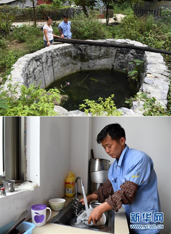 拼版照片:上圖為在廣西都安瑤族自治縣下坳鎮(zhèn)加八村龍力屯,袁朝強(右)和妻子羅蘭香站在水井邊(2017年10月12日攝);下圖為在廣西都安瑤族自治縣下坳鎮(zhèn)車家莊扶貧搬遷安置新區(qū),袁朝強在自家新房里使用自來水洗碗(2017年10月12日攝)。新華社記者陸波岸攝