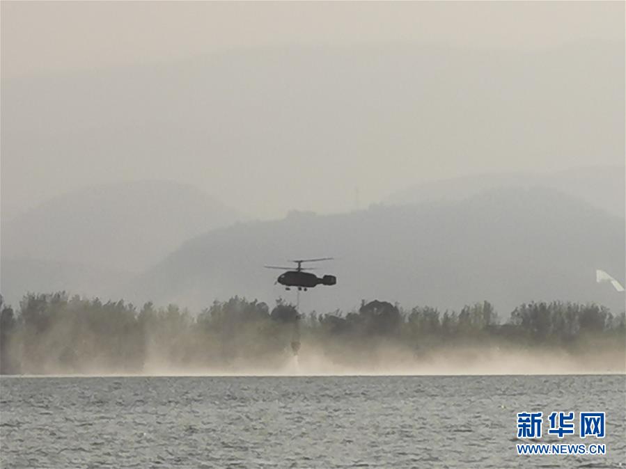4月1日,一架參與西昌森林火災滅火的直升機在邛海中取水(手機拍攝)。新華社記者惠小勇攝
