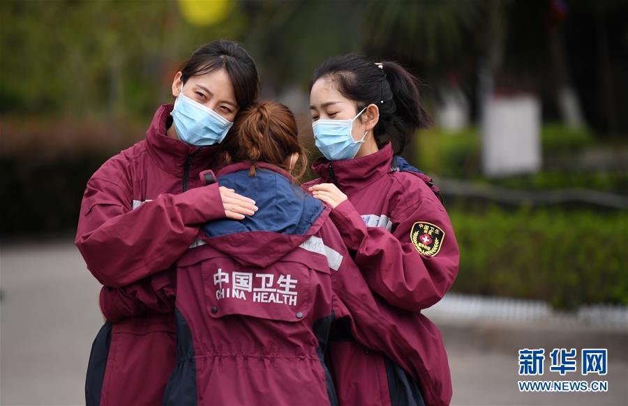 4月3日,陜西醫(yī)療隊(duì)隊(duì)員擁抱告別。 當(dāng)日,陜西省第一批援鄂醫(yī)療隊(duì)137名隊(duì)員在陜西省工人療養(yǎng)院結(jié)束了為期兩周的隔離休養(yǎng)。醫(yī)療隊(duì)員與“戰(zhàn)友”深情作別后,陸續(xù)踏上歸途。 新華社記者 李一博 攝