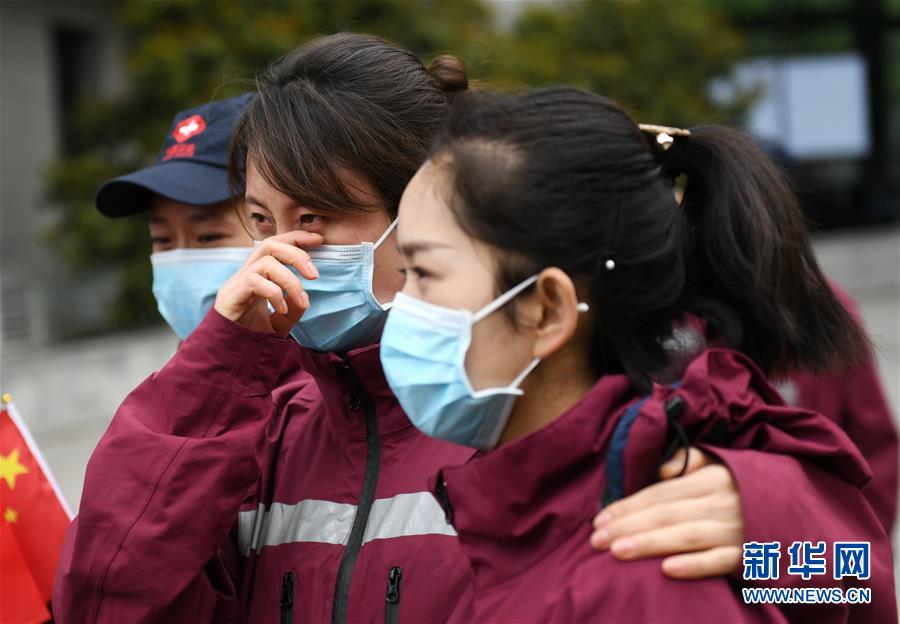 4月3日,來(lái)自陜西省榆林市第一醫(yī)院的醫(yī)療隊(duì)隊(duì)員王晶晶(中)在送別“戰(zhàn)友”后落淚。 當(dāng)日,陜西省第一批援鄂醫(yī)療隊(duì)137名隊(duì)員在陜西省工人療養(yǎng)院結(jié)束了為期兩周的隔離休養(yǎng)。醫(yī)療隊(duì)員與“戰(zhàn)友”深情作別后,陸續(xù)踏上歸途。 新華社記者 李一博 攝