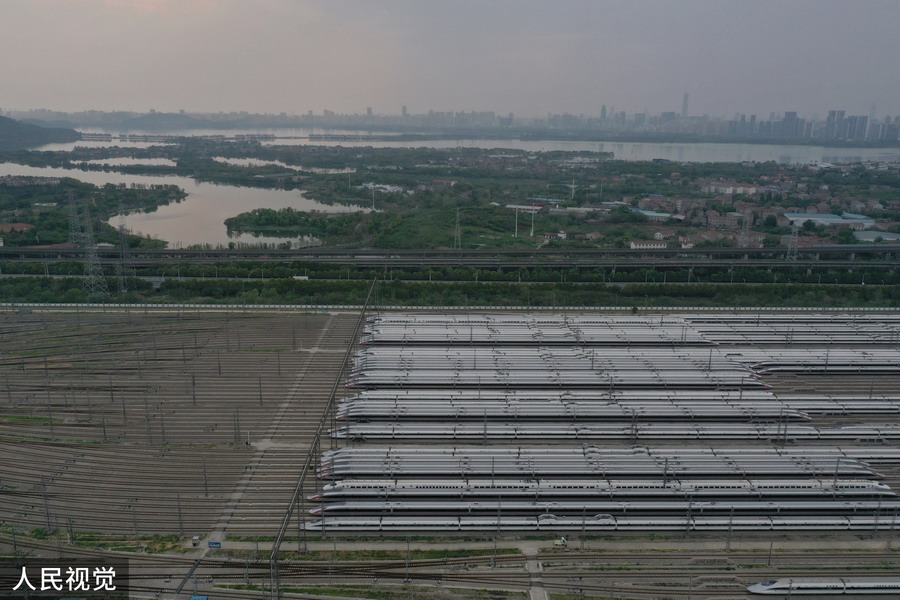 2020年4月6日,武漢動(dòng)車(chē)段高鐵動(dòng)車(chē)組整裝待發(fā)(無(wú)人機(jī)照片)。