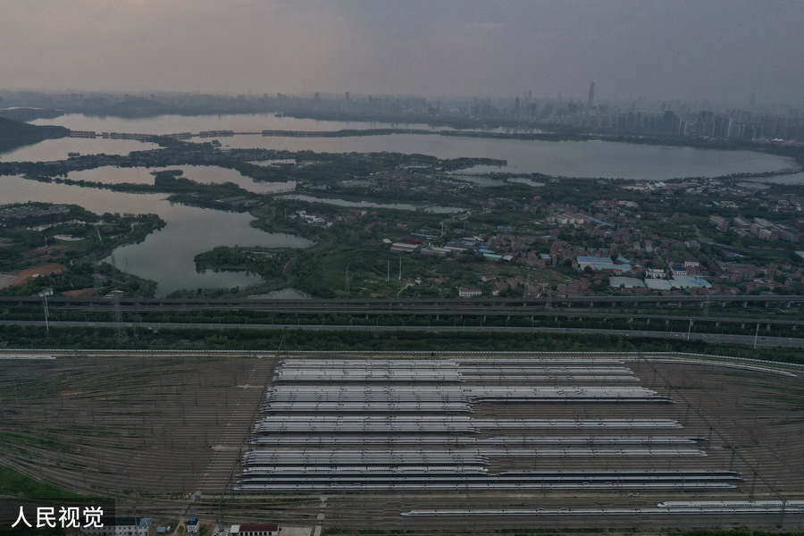 2020年4月6日,武漢動車段高鐵動車組整裝待發(fā)(無人機(jī)照片)。