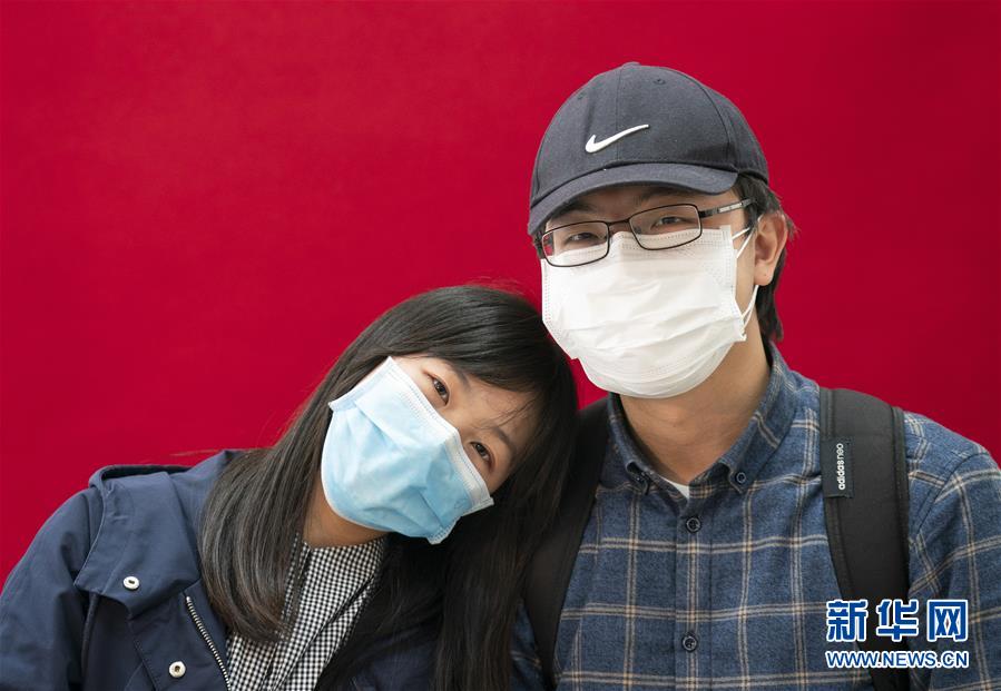 4月7日,在武漢市江岸區(qū)民政局婚姻登記處,陳先生與張女士隔著口罩親吻。 新華社記者才揚(yáng)攝