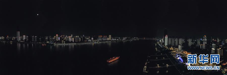 這是4月7日晚拍攝的武漢市江漢關(guān)博物館附近的長江兩岸建筑燈光夜景(無人機拍攝)。新華社記者沈伯韓攝