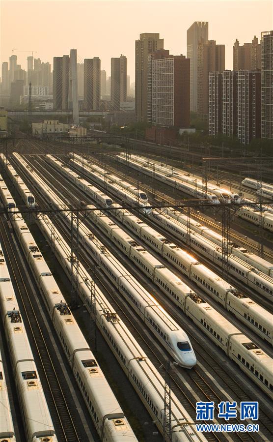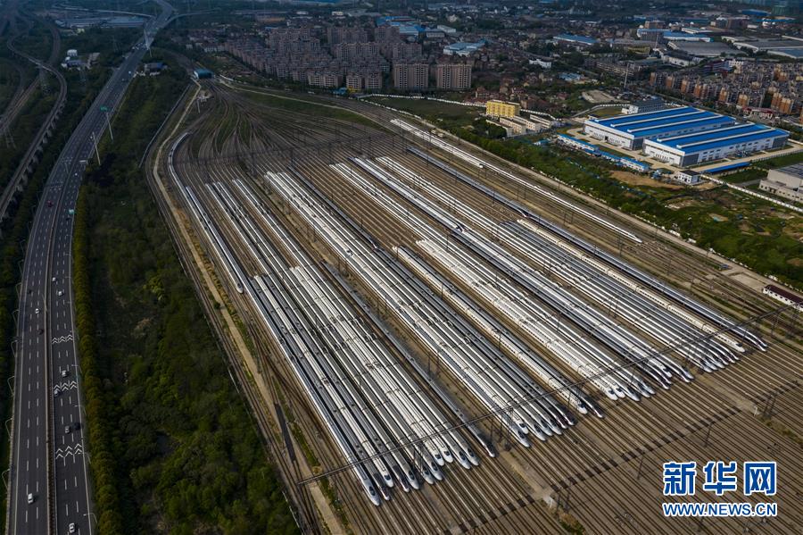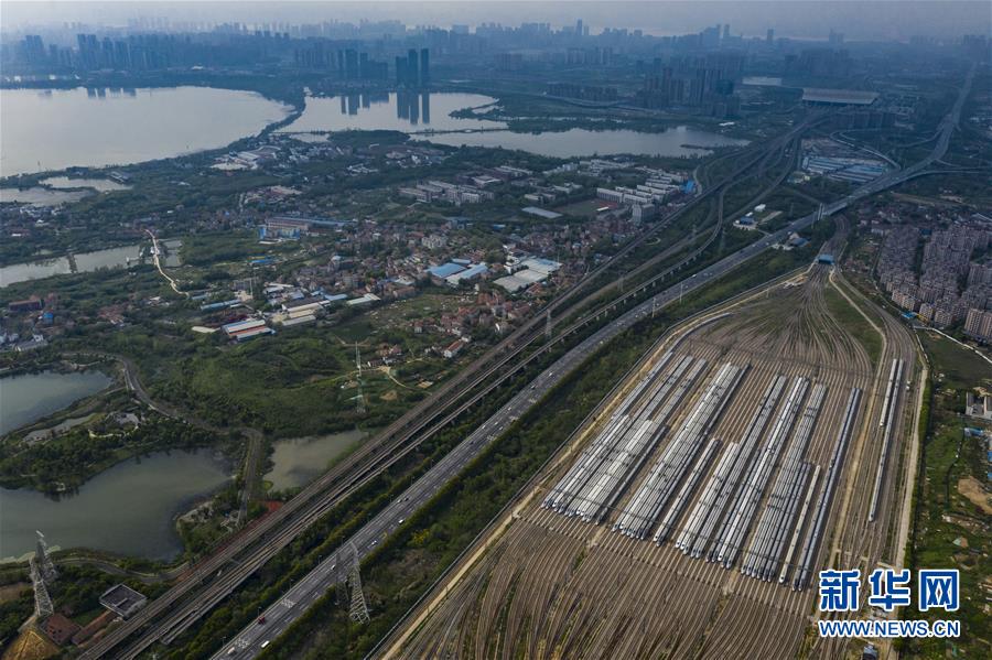 4月7日,在武漢動(dòng)車(chē)段,列車(chē)??吭诖孳?chē)線上(無(wú)人機(jī)照片)。新華社記者 沈伯韓 攝
