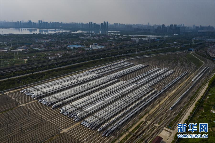 4月7日,在武漢動(dòng)車(chē)段,列車(chē)停靠在存車(chē)線上(無(wú)人機(jī)照片)。 新華社記者 肖藝九 攝