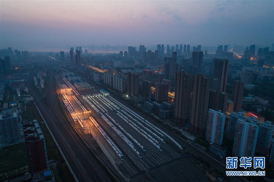 4月8日,在武漢動(dòng)車段,列車停靠在存車線上準(zhǔn)備投入運(yùn)行(無人機(jī)照片)。 新華社記者 肖藝九 攝