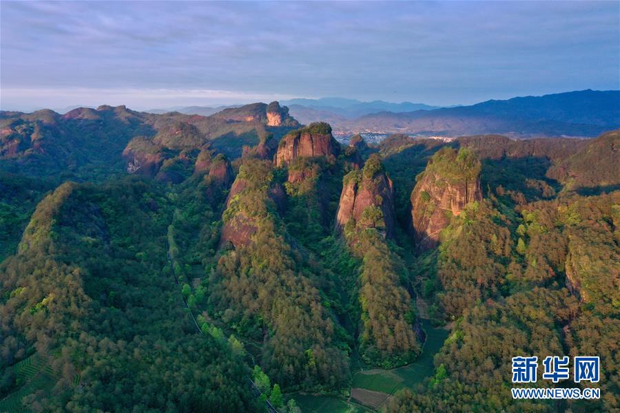 這是夕陽(yáng)照射下的武夷山國(guó)家公園丹霞群巒(4月1日攝,無(wú)人機(jī)照片)。新華社記者姜克紅攝