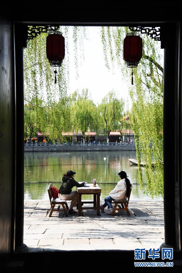 4月13日,游客在濟南百花洲歷史文化街區(qū)沿街座位上作畫。新華社記者王凱攝
