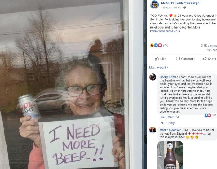 據(jù)報(bào)道,老太太表示,自州長(zhǎng)下令居家避疫后,她盡好公民本分,未曾離開(kāi)家門(mén)。但后來(lái)眼見(jiàn)只剩兩罐啤酒,于是想出這個(gè)辦法向鄰居及女兒求援,不料獲得廠商關(guān)注,老太太最終獲啤酒商贈(zèng)送150罐啤酒,并留下有趣組圖。