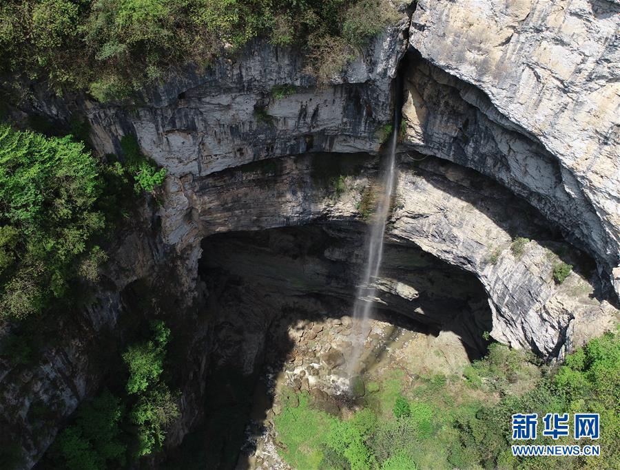 這是在陜西省漢中市寧強(qiáng)縣火石子村用無(wú)人機(jī)拍攝的地洞河天坑內(nèi)的一處瀑布。新華社張博文攝