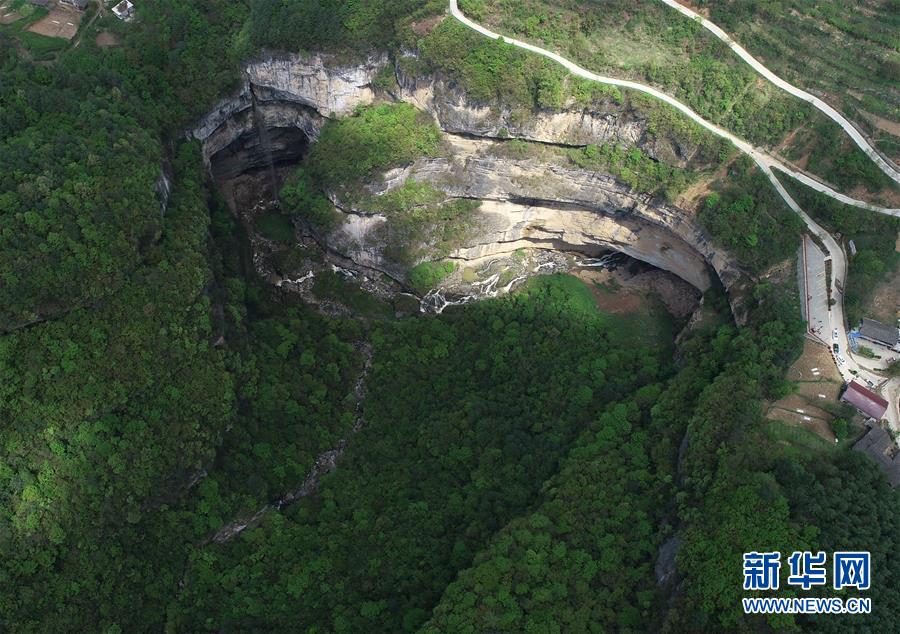 這是在陜西省漢中市寧強縣火石子村用無人機拍攝的地洞河天坑。新華社張博文攝