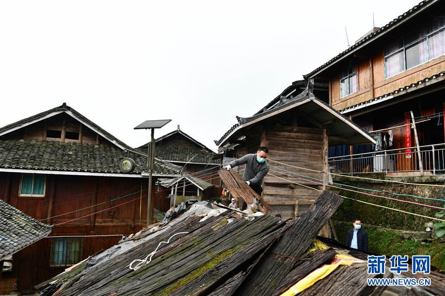 貴州省從江縣加榜鄉(xiāng)黨扭村村民在整治吊腳樓風(fēng)貌(4月16日攝)。貴州省從江縣把人居環(huán)境整治作為脫貧攻堅(jiān)工作的一項(xiàng)重要舉措來(lái)抓,對(duì)鄉(xiāng)村規(guī)劃范圍內(nèi)長(zhǎng)期無(wú)人居住的危房、廢棄禾倉(cāng)、棚圈、柴草房和房前屋后的殘?jiān)珨啾诘冗M(jìn)行清理整治,進(jìn)行復(fù)墾復(fù)綠,同時(shí)開(kāi)展農(nóng)戶(hù)衛(wèi)生和村寨環(huán)境整治,做到鄉(xiāng)村環(huán)境干凈、衛(wèi)生、整潔,扮靚美麗鄉(xiāng)村。新華社記者楊文斌攝