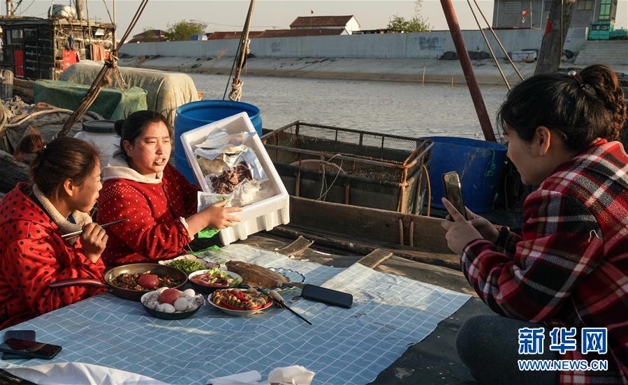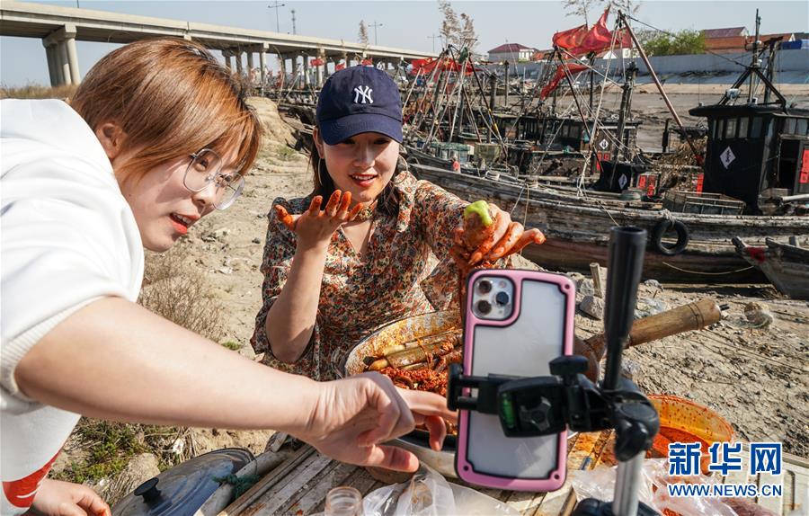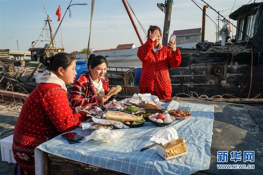 4月22日,馬花雨(下右)、徐紅紅(上)、陸倩(下左)在漁船上拍攝推銷海產(chǎn)品的短視頻。近年來,江蘇省連云港市贛榆區(qū)海頭鎮(zhèn)越來越多的居民開始直播銷售海產(chǎn)品,當(dāng)?shù)貪O船、碼頭和市場(chǎng)上活躍著一批網(wǎng)絡(luò)直播好手。目前,全鎮(zhèn)有3000多戶商家從事海產(chǎn)品直播銷售業(yè)務(wù),形成了集捕撈、加工、包裝、銷售和物流于一體的電商產(chǎn)業(yè)鏈。新華社記者楊磊攝