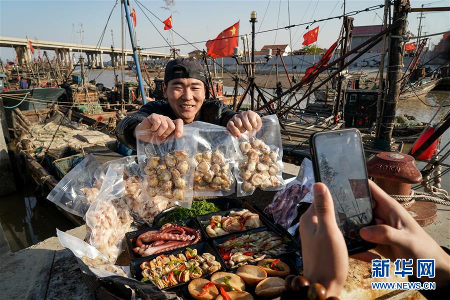 4月22日,31歲的顧峻豪(左)在朱蓬口漁港拍攝短視頻推銷海產(chǎn)品。他從去年9月起開始做網(wǎng)絡(luò)主播銷售海產(chǎn)品,目前已有12萬粉絲。新華社記者楊磊攝