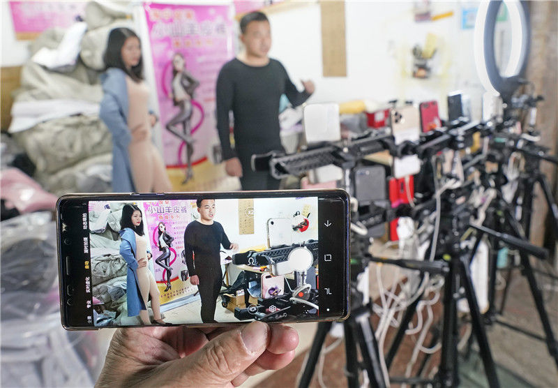 2019年11月9日,浙江金華,義烏北下朱村,倆主播在直播銷售保暖內(nèi)衣。
