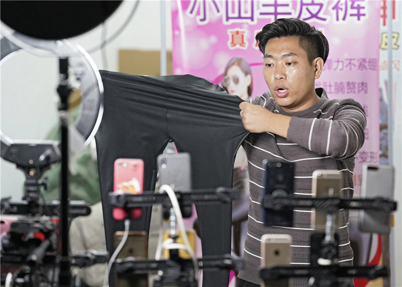 2019年11月10日,浙江金華,義烏北下朱村,男主播在直播銷售皮褲。