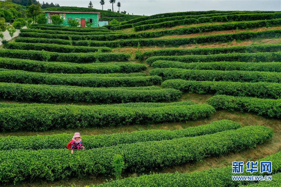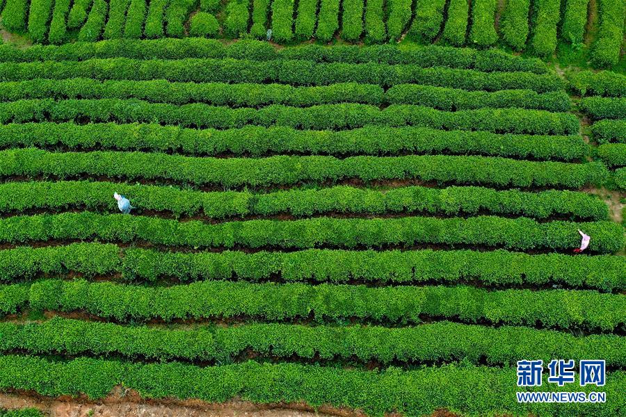 4月25日,茶農(nóng)在“扶貧茶園”內采茶(無人機照片)。谷雨過后,在貴州省黔東南苗族侗族自治州丹寨縣“扶貧茶園”,茶農(nóng)搶抓農(nóng)時趕制春茶。丹寨縣創(chuàng)新產(chǎn)業(yè)扶貧模式,鼓勵社會公眾線上認領茶園,再由茶園聘請當?shù)刎毨魟展?,為貧困戶?chuàng)造茶園管理、采茶、制茶等就業(yè)機會,幫助貧困戶增收。今年以來,“扶貧茶園”已接受線上預訂600余畝,給當?shù)?00余名村民提供了就業(yè)機會。新華社記者歐東衢攝